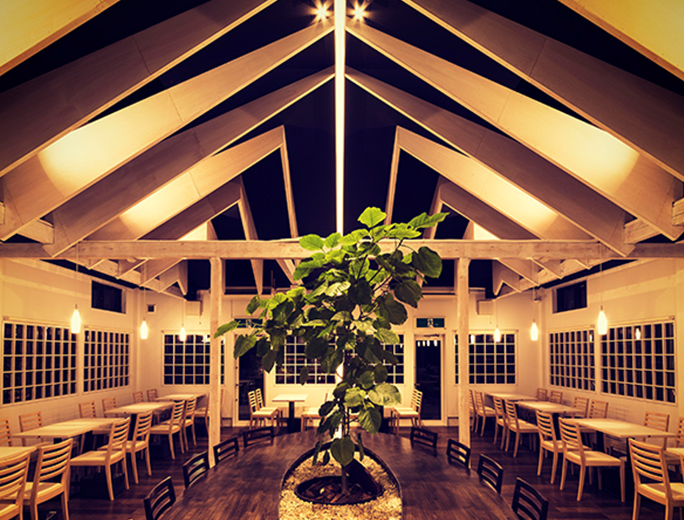 大屋根で包み込まれた印象的な外観