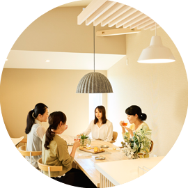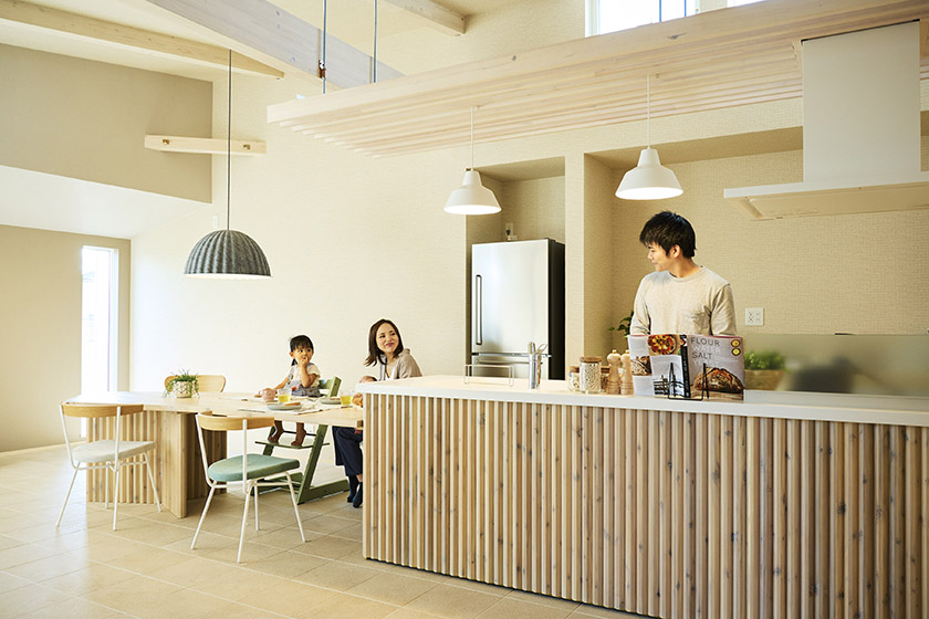 家族が揃う食事の時間、ダイニングキッチンを家族のコミュニケーションの中心にすることで忙しい平日でも家族との時間を大切にお過ごしいただけます。休日には、友人とともに開放的なダイニングキッチンでホームパーティを楽しむことができます。