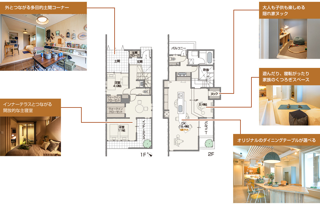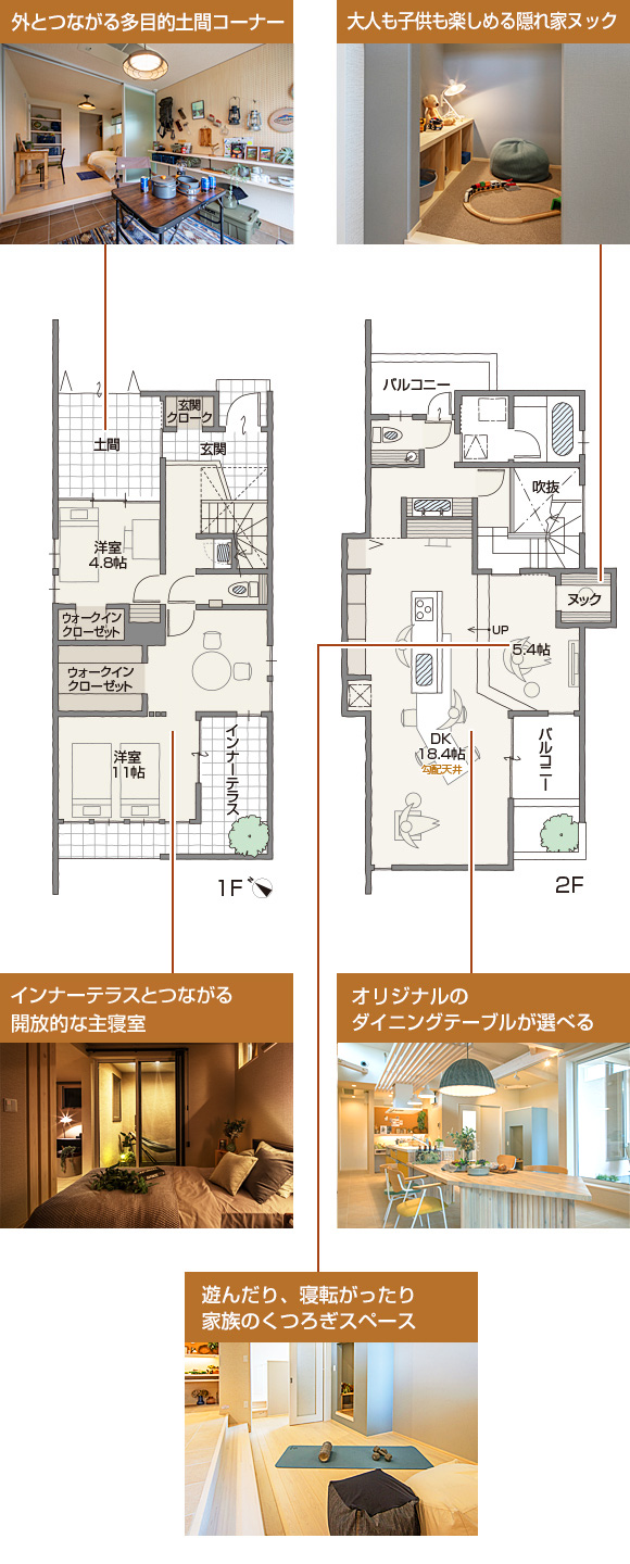 家族構成や夫婦の生活リズムに合わせて、1Fの間取りを6プランから選ぶことができます。個人部屋であっても家族のつながりを感じる空間の中、心地よくプライベートタイムを過ごしていただけます。