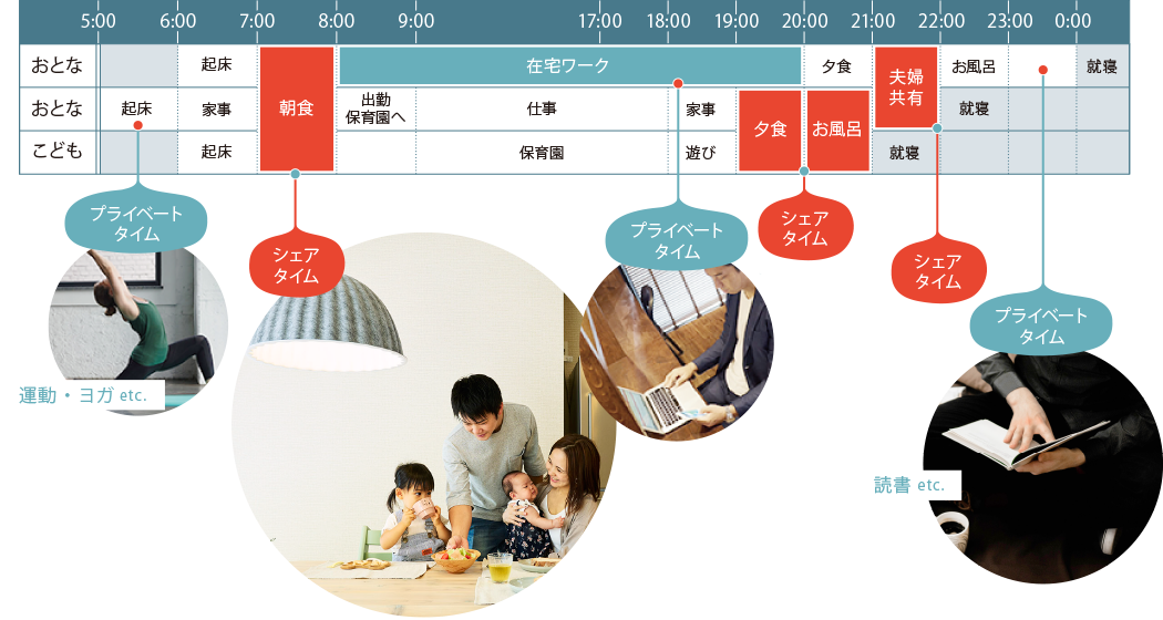 子育てをする家庭では、プライベートタイムがそれぞれ夫婦で違うため、家族時間と個人時間のバランスが重要。