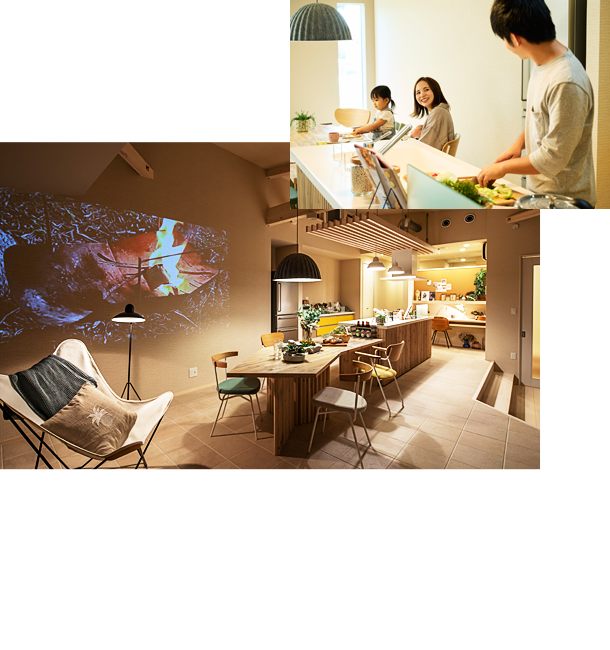 ダイニングキッチンを家族時間の中心とすることで、リビングを多目的ルームとしてエクササイズやホビー等、家族それぞれの過ごし方を楽しんでいただけます。また、玄関とつながる土間も趣味スペースとして、個人時間をゆったり過ごしていただけます。