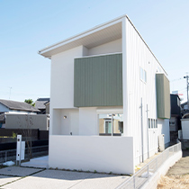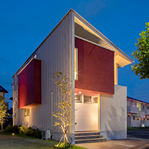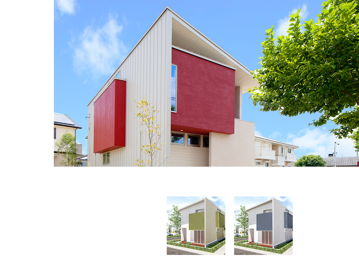 板金素材の大屋根で包み込まれた外観イメージ。屋根裏側などには当社オリジナル木建材「WALLWOOD」や木製サッシなど本物の木を使いやさしい素材感と共に家族のプライベート空間を包みます。カラーバリエーションは3色でエンジ、グリーン、スカイブルーをご用意。