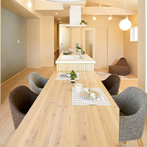 玄関とつながる多目的土間コーナーは、外から土間、居室とつながる一つの空間として使用でき、アウトドアなど趣味を楽しんでいただけます。オープンキッチンと一体化したダイニングテーブルでは、家族とコミュニケーションをとりながらゆったりと食事を過ごしていただけます。