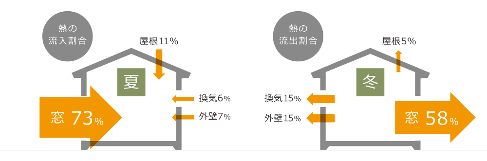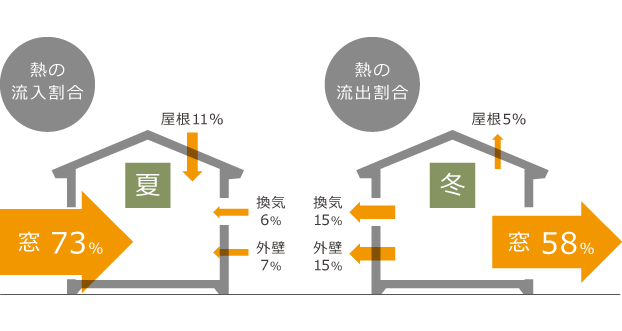 一般住宅において、熱の出入りがもっとも多いのは、屋根や外壁よりも、窓やドアなどの開口部。冬の暖房時に家から逃げる熱のうち、窓やドアの開口部を通るものが約半分。つまり、冬を暖かく過ごすには、開口部からの逃げる熱をふせぐ断熱が重要です。
