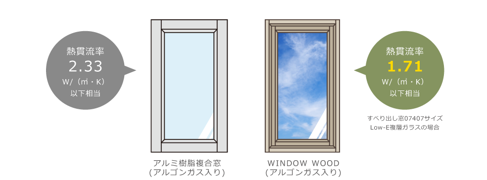 デザイン性だけではなく、さまざまな性能に優れている木製窓、「WINDOW WOOD」。気密性は最高等級を取得しており、片引き戸の気密性は等級基準2.0m3/h・m2を大きく上回る、0.38m3/h・m2。スライディング系の窓としては驚異的な気密性能です。これにより、アルミサッシよりも高い断熱性を有しています。