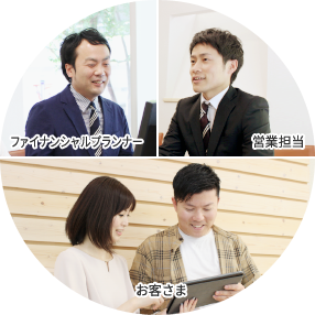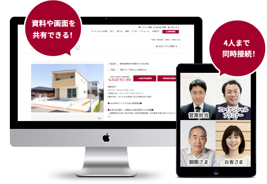 カメラ付パソコン、もしくはタブレット端末を使用し、オンラインで営業担当とご商談できます。実際に物件詳細資料や画面等をモニターへ共有しながら、しっかりと気になるポイントをご説明。またファイナンシャルプランナーや遠方のご両親などを交え、4人まで同時接続ができます。