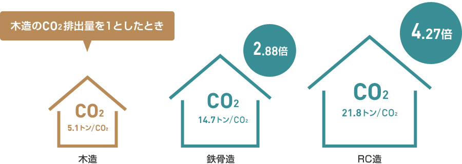 鉄骨やRCと比べても、CO2の排出量の差は歴然。