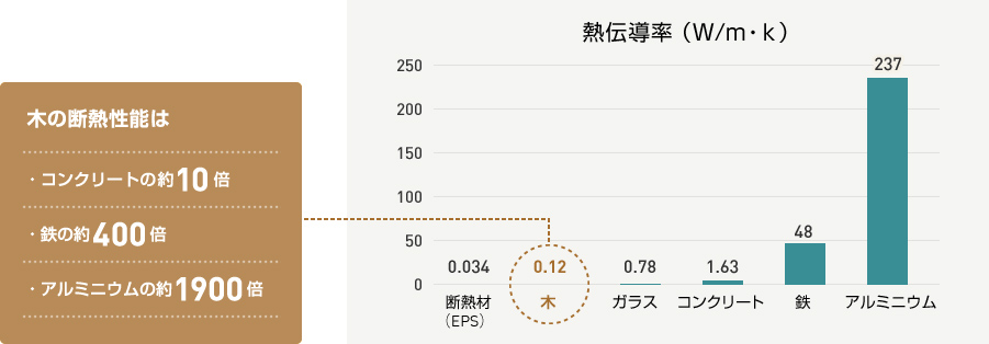 外壁など熱の出入りが多い場所に木を使用することで、見た目にやさしいだけでなく、